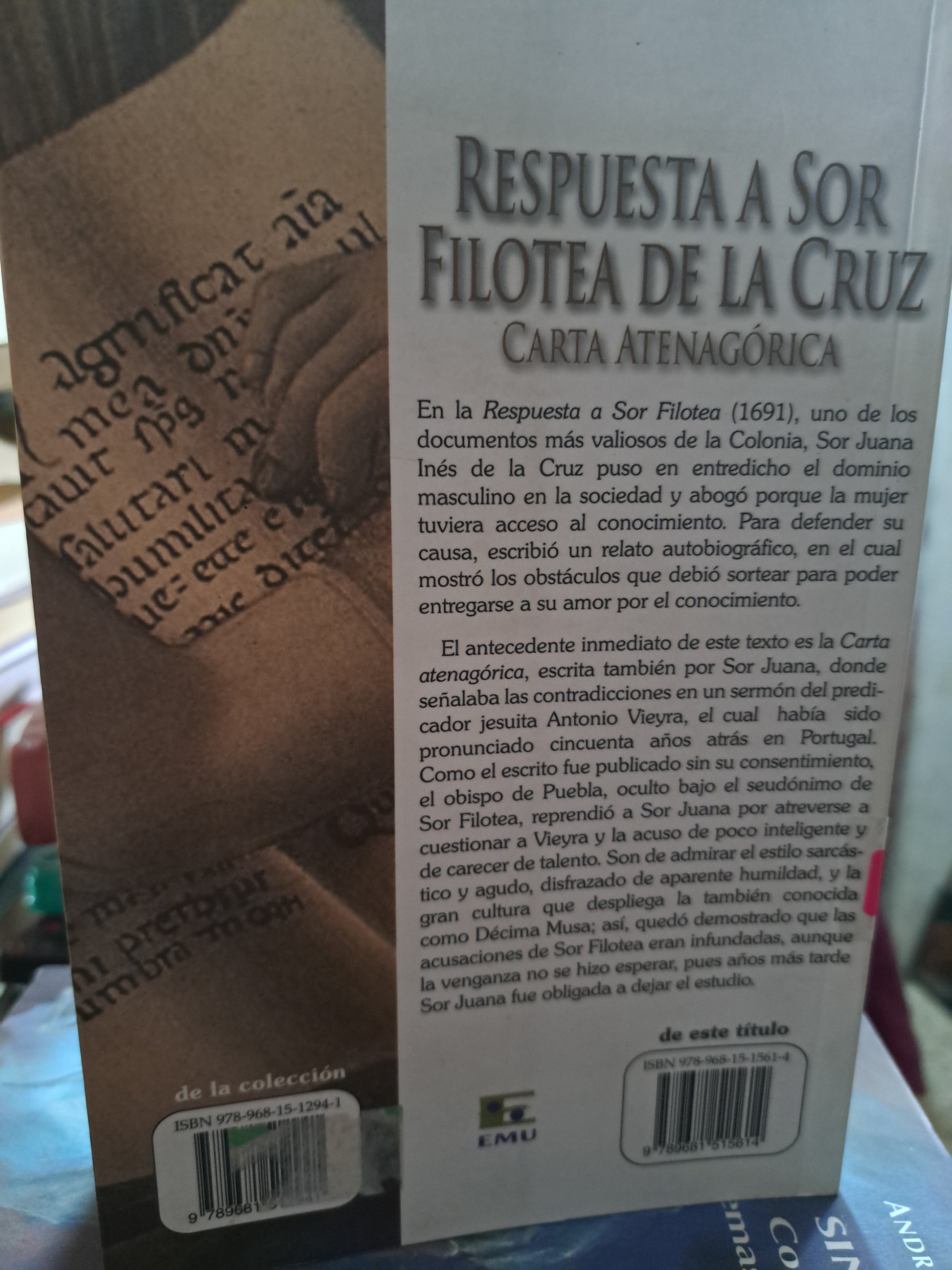 RESPUESTA A SOR FILOTEA DE LA CRUZ CARTA ATENAGÓRICA SOR JUANA INÉS DE LA CRUZ USADO POESÍA ALDAMA