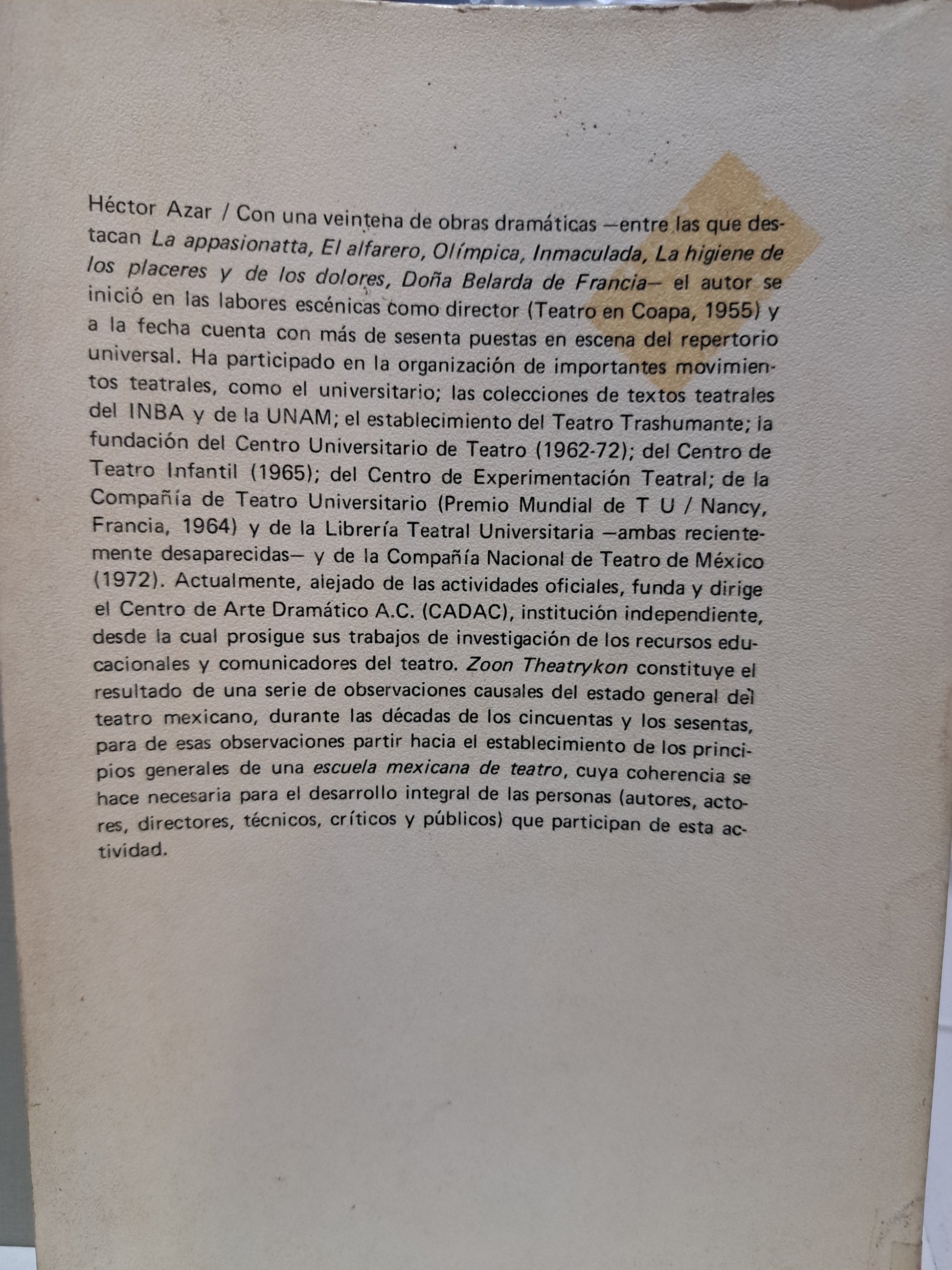 ZOON THEATRYKON (TEORÍA CADAC) HÉCTOR AZAR USADO NOVELA JUÁREZ
